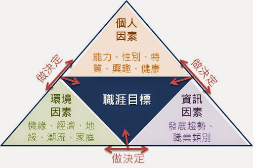 這些年,諮詢過很多關於生涯、職涯選擇的個案。我都會從美國伊利諾大學教授Swain博士提出的生涯金三角的「自我」、「教育與職業資料(資訊)」及「環境」三個面向與大家討論,在這過程,發現大家都習慣先看「自我」與「教育與職業資料(資訊)」這兩方面。